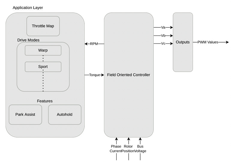 The application layer is where much of the vehicle-level functionality of the motor controller comes in. A simplified diagram of the Application layer with its interface with the FOC is shown below. Throttle response, drive modes, and features such as Park Assist and AutoHold are implemented in this layer. To learn more about the 450X’s smart features, please keep an eye out for the next in this series on our motor controller.