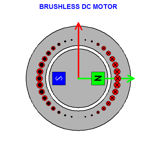 Modern PMSMs do not use slip rings or other mechanical means of switching the current in motor windings. In fact, the stator of the motor (the part that does not move) contains the windings and the rotor (the part that spins) contains the magnets. The position of the rotor is critical for the control of the motor, and is often connected to a resolver or encoder. The control system that reads the encoder position and the currents in the statorcommands a voltage to drive the motor which is known as the Field-Oriented Controller (FOC). It is not the intent of this blog to describe how the stator magnetic field rotates and spins the rotor with it. A good introduction to this can be found in this excellent book by R. Krishnan. To illustrate some basic concepts, here are some animations by Mahmoud Riaz.