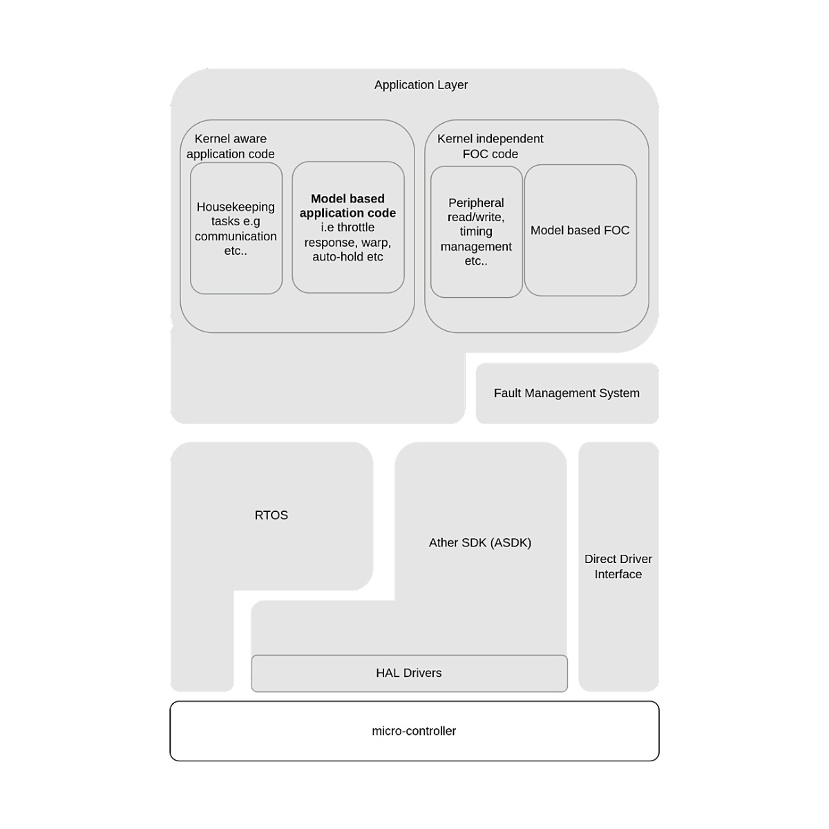 If the FOC was the only thing the microcontroller had to run, this would have been fine, almost easy. However, the microcontroller needs to deal with much more, firstly communication with the rest of the vehicle. The Ather 450X ride experience depends heavily on all the Electronic Control Units (ECU) communicating in a coordinated fashion. Secondly, the microcontroller has to run other features that make the 450X unique and are crucial to the performance, such as the Warp Mode, the Park Assist or the AutoHold. For all this, the motor controller uses an RTOS to manage task priorities and timing. A basic diagram of the firmware architecture is shown below. We will do a deep dive into memory management, RTOS selection, and configuration, as well as the Ather Software Development Kit (ASDK) in another blog post.
